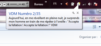 Un programme qui affiche sous la forme d'infobulles Windows à intervalle régulier dans la barre des tâches les derniéres VDM postées sur le site http://www.viedemerde.fr/ .