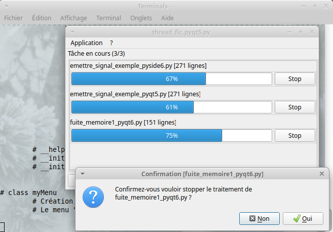 ) - 1. Pour de très gros fichiers, cela peut consommer beaucoup de mémoire et prendre du temps, bloquant potentiellement l'interface utilisateur pendant cette initialisation. Possible de faire ce comptage dans le thread de travail ? - Ligne 530 self.__work.terminate(). Il arrête le thread de manière abrupte, sans lui donner la chance de libérer proprement ses ressources. La méthode stop semble être plus adapté, qu'en penses-tu ?
